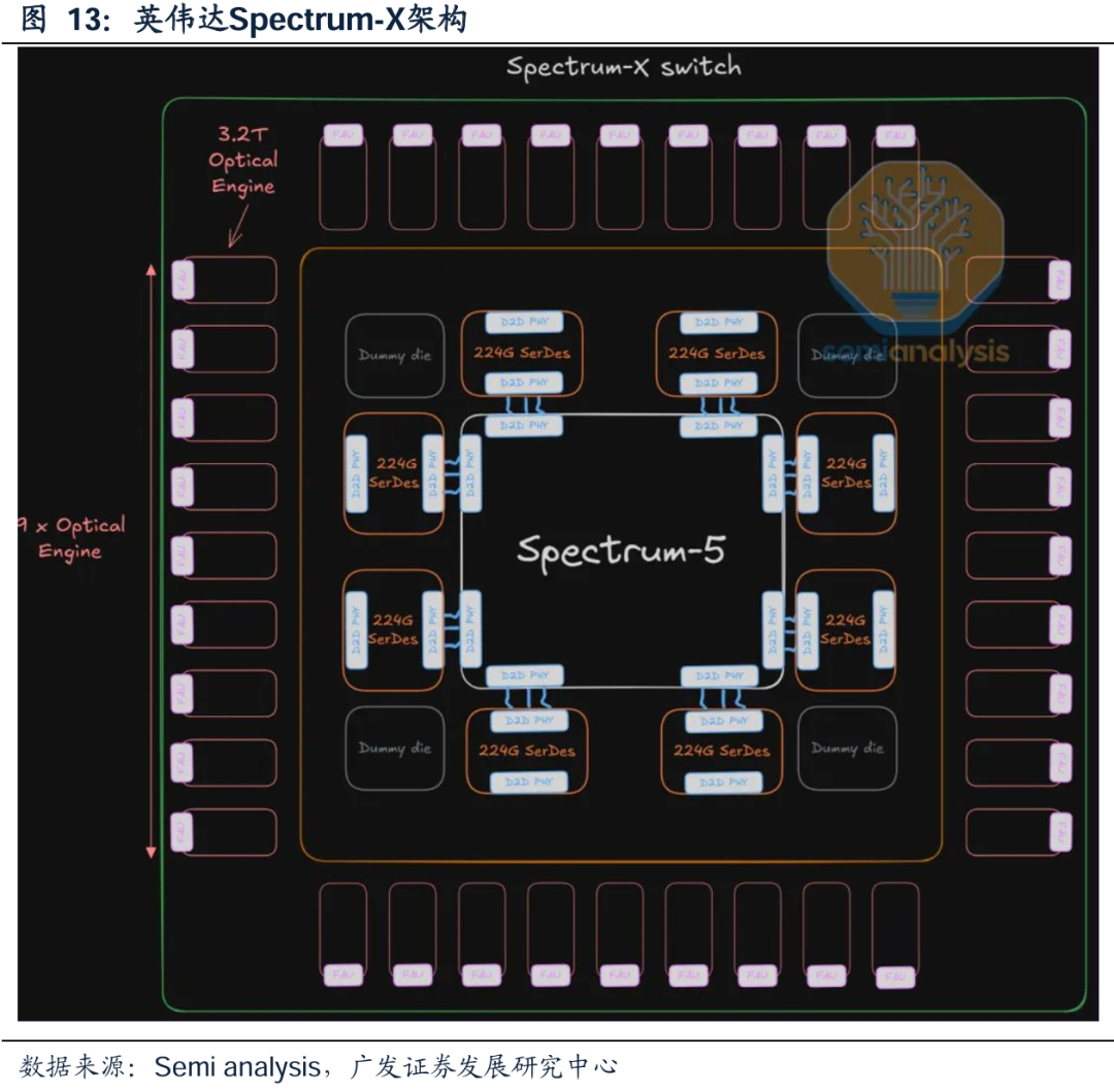 Spectrum-X:Spectrum-X Photonics平台代表CPO交换机技术的下一步演进,该产品线包括Spectrum 6810提供102.4T的总带宽和Spectrum 6800通过四封装设计提供409.6T带宽的两种配置。Spectrum-X不同于使用四个独立的单片交换封装的Quantum X800-Q3450,Spectrum-X采用多芯片模块,中心是更大的102.4T交换ASIC,周围环绕八个224G SerDes输入/输出chiplet,每侧两个chiplet。每个Spectrum-X光子多芯片模块交换封装在单个102.4T交换封装中集成36个光引擎。