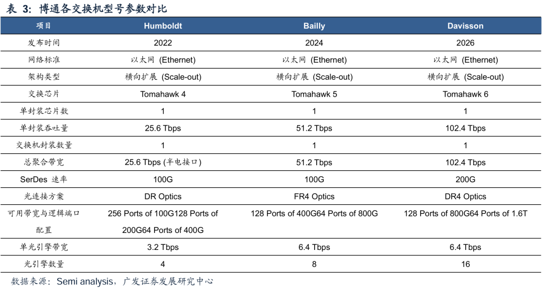 博通在CPO交换机领域布局较早,2022年就已推出首款CPO交换机。根据Semi analysis,博通第一代CPO器件称为Humboldt,基于Tomahawk 4交换ASIC,于2022年推出时主要作为概念验证。第二代CPO器件Bailly基于Tomahawk 5交换ASIC,在2024年推出。2026年,博通正在推出基于Tomahawk 6交换ASIC的Davisson CPO交换机。
