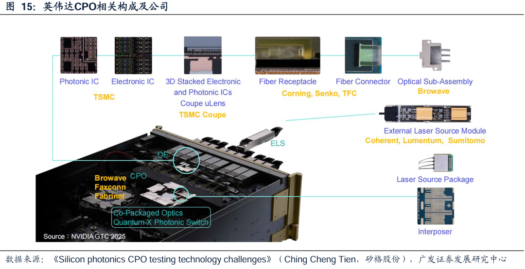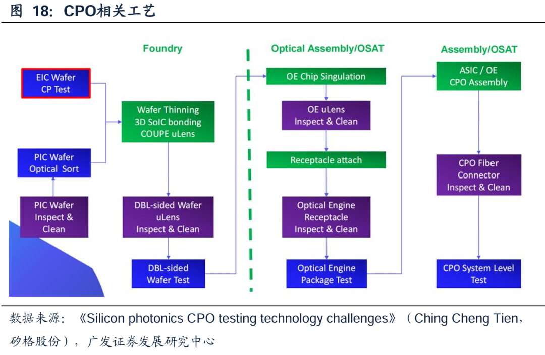 CPO制造涉及“光源 FAB 封装”等多方配合。根据《Silicon photonics CPO testing technology challenges》(Ching Cheng Tien,矽格股份),以英伟达的Quantum-X Photonic Switch为例,CPO制造涉及到的工艺/技术同时包含了前道工艺的刻蚀、薄膜沉积等以及后道工艺的键合、切片等,工序较为复杂,需要Fab端、光学组装端和封装端等多个主体共同合作。
