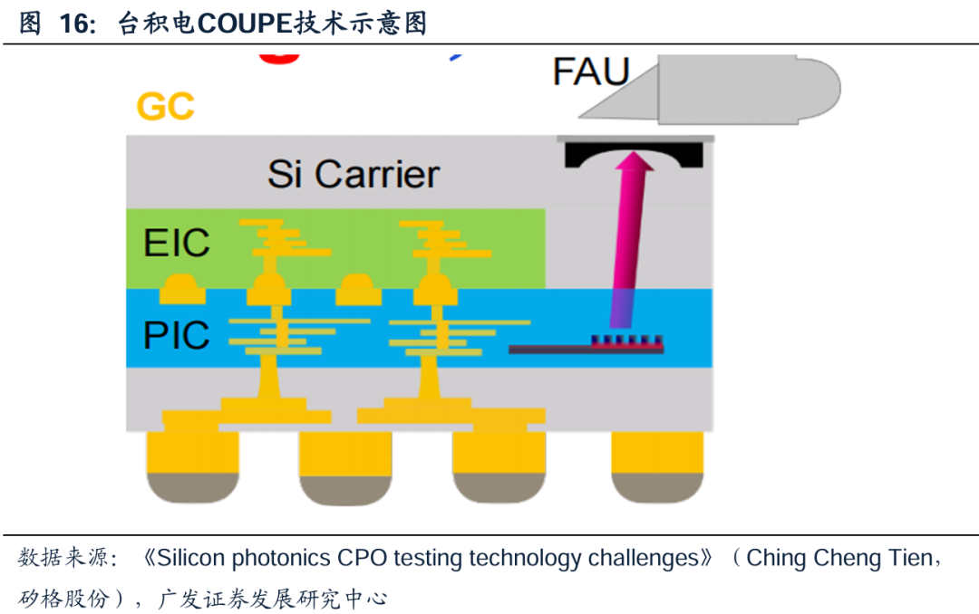 2.交换机级别的CPO。在CoWoS基板级CPO中部署COUPE,功耗降低2倍、延迟降低10倍,主要应用于光引擎和交换芯片的CPO。