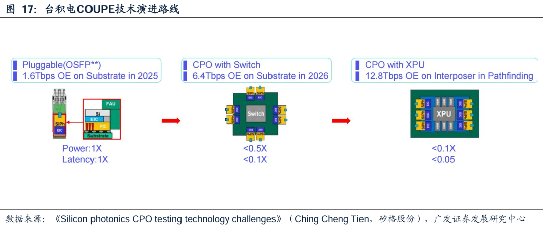 3.XPU级别的CPO。在CoWoS中介层上部署COUPE,功耗再降5倍、延迟再降2倍,直接实现光引擎与计算核心的CPO,极致逼近算力核心。