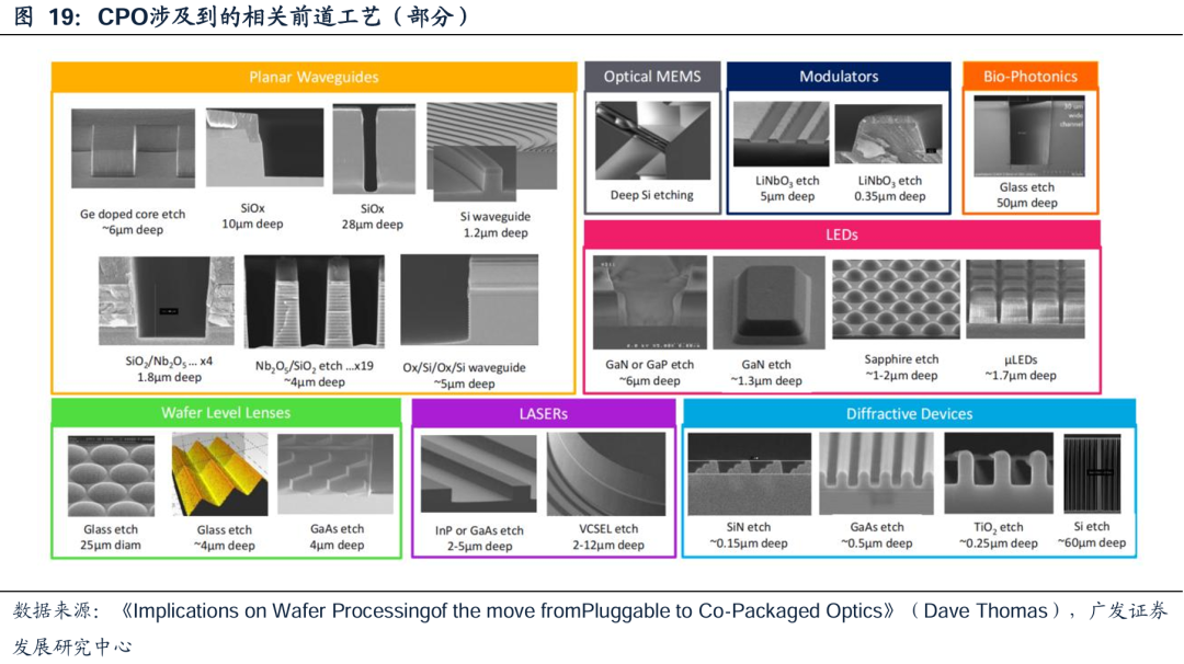 CPO涉及多种前道工艺。根据《Implications on Wafer Processingof the move fromPluggable to Co-Packaged Optics》(Dave Thomas),CPO由于涉及到“光”器件的相关功能实现,其中涉及到: