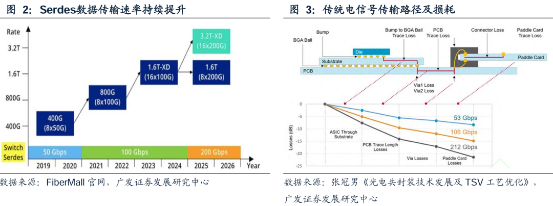 电信号传输速率提升会加剧电信号长传输过程中信号失真问题。在信号完整性方面,根据张冠男《光电共封装技术发展及TSV工艺优化》,电信号在导体内的传输存在损耗,且速率越高损耗越大。在传统电芯片封装体中,1310nm波长光纤的典型传输损耗为0.35dB/Km,而高速电信号的板级传输损耗即高达5dB以上。因此,随着SerDes电信号速率的不断增大,为了满足高速信号的长距离低损耗传输,将电信号转化成光信号进行传输势在必行,其中缩短光模块核心器件与交换ASIC的电信号传输距离是主要优化方向。