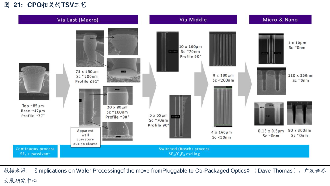 TSV(硅通孔)工艺。在CPO的3D堆叠中,TSV替代长距离主板布线,将电信号路缩短为 “封装内垂直互联”,可以实现降低功耗、降低延迟的效果。