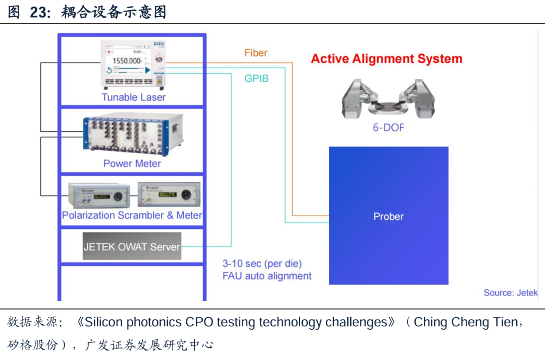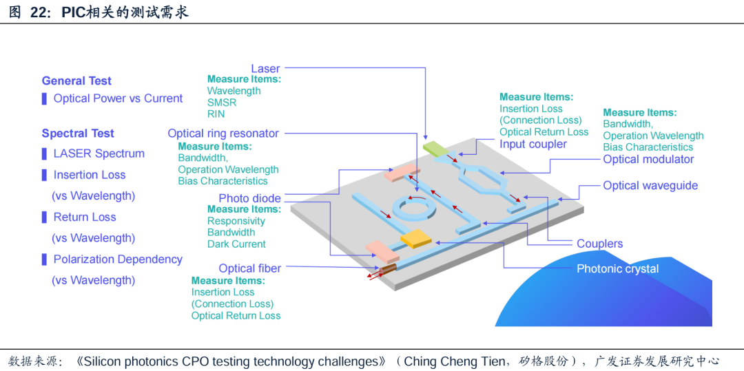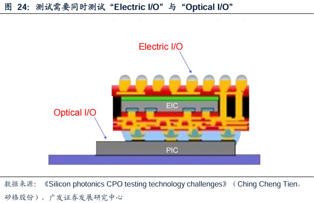 CPO的测试涉及光与电的测试。传统的半导体测试,一般只涉及电的测试,这方面已经比较成熟,而CPO因为同时集成了EIC与PIC,需要叠加“光”方面的测试,而本身PIC是不发光的无源器件,测试难度也就相应加大,涉及到了测试机、探针卡、耦合模块、标准测试仪器的开发。