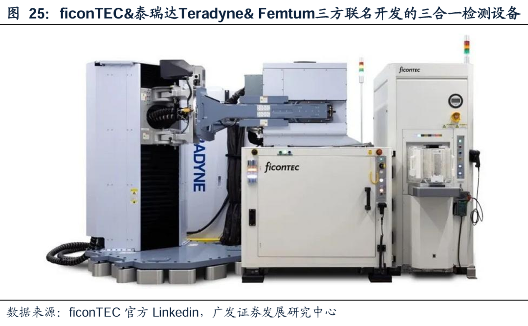 三合一设备或成未来主流。根据ficonTEC官方Linkedin,公司在25年3月宣布推出ficonTEC&泰瑞达Teradyne& Femtum三方联名开发的设备,即晶圆级双面“光电”测试 激光清洁 激光修复三合一设备。最左边是泰瑞达机台,作为全球半导体测试机的龙头,主要负责在对封装晶圆进行高频电信号的测试,中间则是ficonTEC机台,需要在电信号接通的同时完成光的测试,最右则是Femtum的激光清洁与修复模块,对测试环节发现的缺陷,进行激光修复。