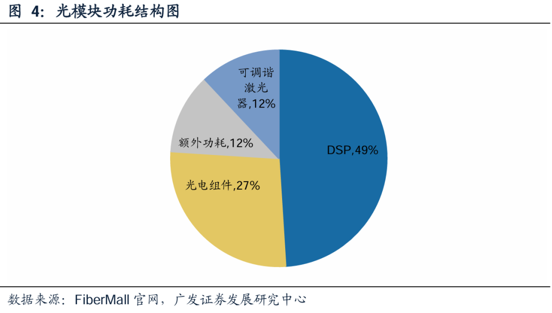 为补偿信号衰减,光模块会使用DSP芯片来重新定时和重整长距离传输来的电信号。根据Semi analysis,DSP芯片是光模块中最耗电且价格最昂贵的组件之一,在功耗层面,DSP占模块总功耗的近50%,800G和1.6T光模块中DSP芯片的功耗分别为6-7W和12-14W;在成本层面,若采用高端品牌的光模块,DSP芯片可占集群总拥有成本的近10%。因此降低交换ASIC与光模块之间的传输距离,进而舍弃DSP芯片是重要发展方向。