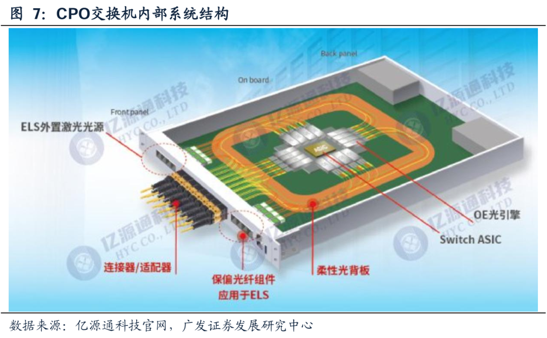 从结构来看,CPO核心变化是舍弃了DSP交换芯片并外置了ELS激光光源。根据亿源通科技官网,CPO交换机以交换芯片ASIC为中心,将OE光引擎与ASIC直接共封装在同一基板或中介层上。CPO采用了ELS外置激光光源方案,通过保偏光纤组件将纯净激光输送至光引擎内部,同时通过柔性光背板实现光信号的柔性布线与高密度连接,最终由连接器/适配器对接外部光纤链路。光引擎接收到电信号后,利用ELS注入的连续激光完成电光调制,将数据“刻”在光载波上,再通过柔性光背板和连接器输出到光纤中传输。接收端则反向操作,将光信号解调成电信号传回ASIC。