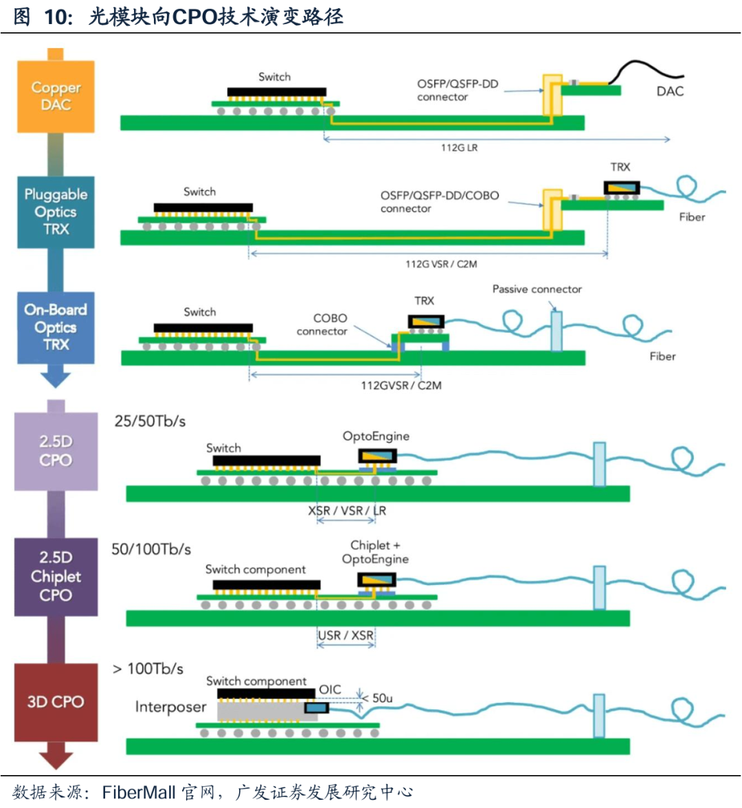 光模块向CPO的发展阶段是按照距离缩短程度和封装技术来划分。为了缩短交换芯片ASIC与光模块之间的传输距离,可插拔光模块技术先采用近封装光学NPO(On-BoardOptics)方案,在NPO中光引擎将被直接贴在芯片旁的板卡上,电互联距离大幅缩短至厘米级,有效降低了损耗与功耗,是通往CPO的关键过渡形态。CPO是从2.5D封装开始,在CPO中光引擎与交换芯片被集成在同一基板或Chiplet上,电互联距离压缩到毫米级,实现了XSR/VSR等高速电信号的低损耗传输,功耗和密度均得到革命性提升。随着封装技术向3D演进,3DCPO成为终极方向,3DCPO通过硅中介层实现芯片与光引擎的垂直堆叠,互联距离进一步压缩至50微米级。