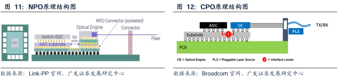 目前NPO是光模块向CPO发展的过渡阶段,CPO与NPO的本质区别是光引擎与ASIC是否共用基板。在NPO中,光引擎与交换芯片ASIC分别封装,但安装在同一块PCB板上并通过PCB走线连接,电气互连距离较长。在CPO中,光引擎与交换芯片直接集成在同一个封装基板或封装壳体内,电气互连距离短。