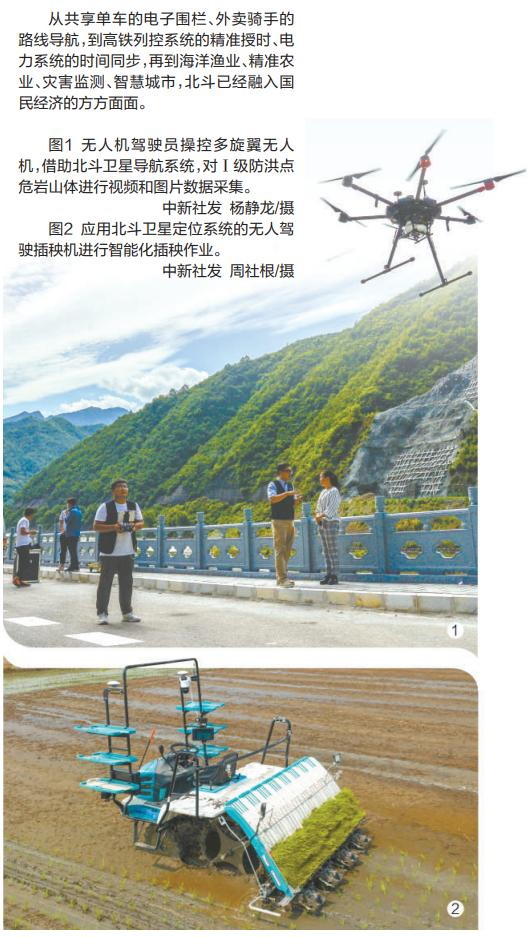北斗还赋能了海洋渔业、农业等。目前,全国超过80万艘渔船安装了北斗终端。台风来临时,渔政部门通过北斗短报文向海上渔船群发预警,渔民也通过北斗报告自己的位置;在黑龙江建三江,通过北斗导航,无人驾驶插秧机显著提高了自动种植水平,带动当地农作物产量提高5%以上。在灾害预测方面,利用北斗高精度定位可监测地壳形变、山体滑坡等,结合北斗短报文在通信中断时的应急通信能力,构成了“监测 预警 应急通信”三位一体的防灾减灾体系。