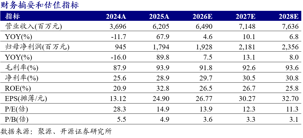 公司2025年实现营收62.05亿元(同比 68%),归母净利润17.94亿元(同比 90%),扣非归母净利润17.31亿元(同比 97%),业绩落于预告上区间,增长主要系《杖剑传说》等新游驱动;单Q4实现营收17.19亿元(同比 96%),归母净利润5.80亿元(同比 102%),扣非归母净利润5.20亿元(同比 97%)。2025年,自研游戏收入占比提升推动毛利率同比 6.0pct至93.90%,营收规模效应释放下销售/管理/研发费率分别同比 7.0/-1.9/-6.2pct,销售费率提升主要系新游发行投入较大(《九牧之野》等影响下Q4同比 15pct),净利率同比 2.7pct至34.6%。2025年末合同负债对比2025Q3末提升约0.98亿元至6.72亿元,增长动能进一步积蓄。公司拟每10股派发现金红利70元(含税),2025年现金分红率达78%。考虑新游上线计划,我们维持2026年、下调2027年并新增2028年归母净利润预测至19.28/21.81/23.56(2027年前值23.12)亿元,当前股价对应PE为13.9/12.3/11.3倍,看好出海及新游上线驱动成长,维持“买入”评级。