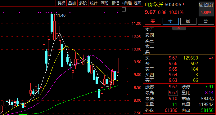 玻纤概念快速拉升,山东玻纤涨停,国际复材、中国巨石、中材科技跟涨。