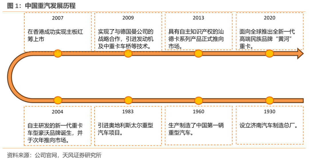 公司前身济南汽车制造总厂,始建于1930年,并于1960 年生产制造了中国第一辆重型汽车,填补了中国重型汽车工业的空白。2004 年,公司自主研发的新一代重卡车型豪沃品牌诞生,并于 2005 年推向市场,当年实现产销过万辆,创造了当时中国重卡行业新纪录。2013年具有自主知识产权的汕德卡系列产品正式推向市场,2020年面向全球推出全新一代高端民族品牌“黄河”重卡。