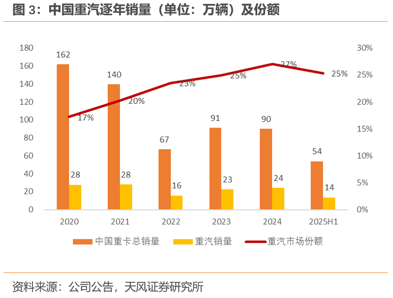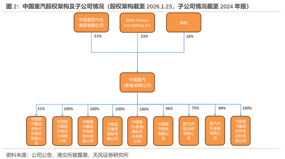 公司第一大股东为中国重型汽车集团有限公司,持股51%,属国资委,第二大股东MAN于2026年1月23日减持2%,目前仍持有23%股权。