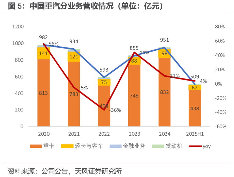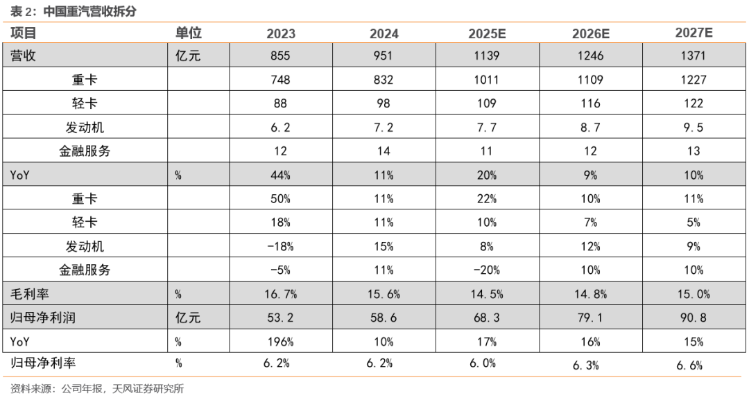 预计 2025-2027 年营收 1139、1246、1371 亿元(YoY 20%、 9%、 10%),归母净利润 68.3、79.1、90.8 亿元(YoY 17%、 16%、 15%);重卡业务为核心营收增长引擎,2025-2027 营收 1011、1109、1227 亿元(YoY 22%、 10%、 11%)。