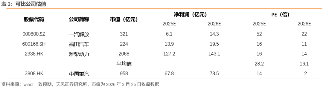 参考同类商用车公司,一汽解放、福田汽车、潍柴动力2026年PE分别为22X、11X、14X。给予中国重汽2026年15X估值,对应股价48.4港元,目标市值1326亿港元。首次覆盖,给予“买入”评级。