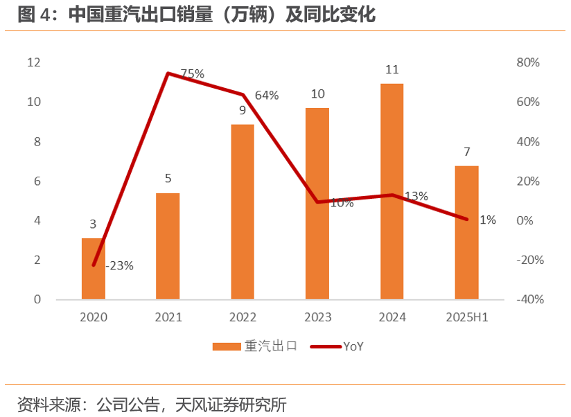 重汽集团市占率快速提升,目前市占率已稳定在25%左右,根据第一商用车网,2025年全年中国重汽共销售30.4万辆重卡,份额提升至26.7%。同时公司出口销量保持稳步提升趋势,根据第一商用车网,2025年出口销量超过15万辆,同比增长14%,出口销量和总销量均为国内行业第一,连续21年蝉联中国重卡出口冠军。
