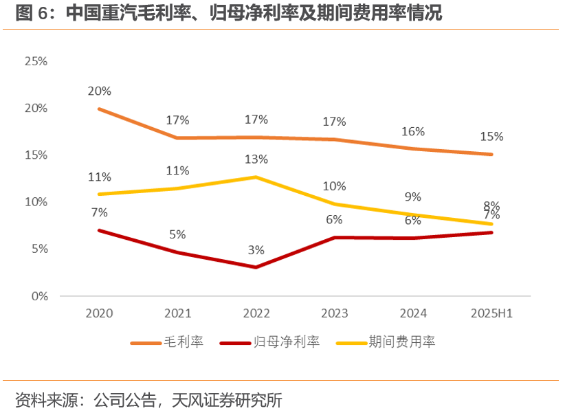 重卡业务贡献公司主要营收,除2022年因在排放标准升级引起的透支消费、库存高企等一系列不利因素影响下,终端需求不断收窄,导致重卡销量下降外,营收在2022年后呈上升趋势。同时公司期间费用率持续下降,带动归母净利率提升。