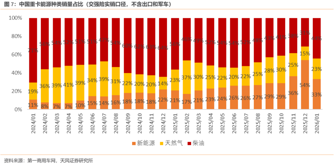 2026年新能源重卡销量延续增长。2026年1-2月新能源重卡共销售2.4万辆,同比增长56%。