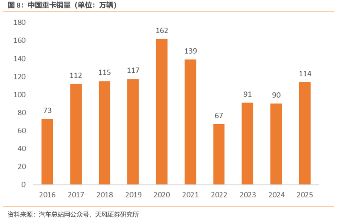 2025年我国重卡累计销售113.7万辆,同比增长26%。按重卡平均约8年的报废周期来看,行业正逐步进入报废/置换高峰期,叠加国家补贴,我们预计国内销量将在未来3年中保持增长趋势。