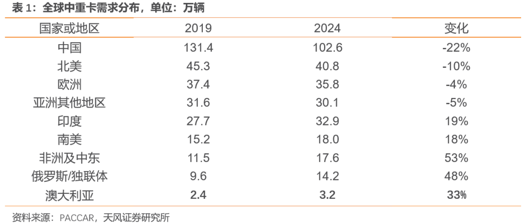 据帕卡统计,从2019年到2024年,中重卡的需求增量主要来自于非洲中东、俄罗斯/独联体、澳大利亚、印度以及南美。其余如中国、欧美等地则需求有所下滑。但从总量看,中国、北美、欧洲仍为需求最大的区域。