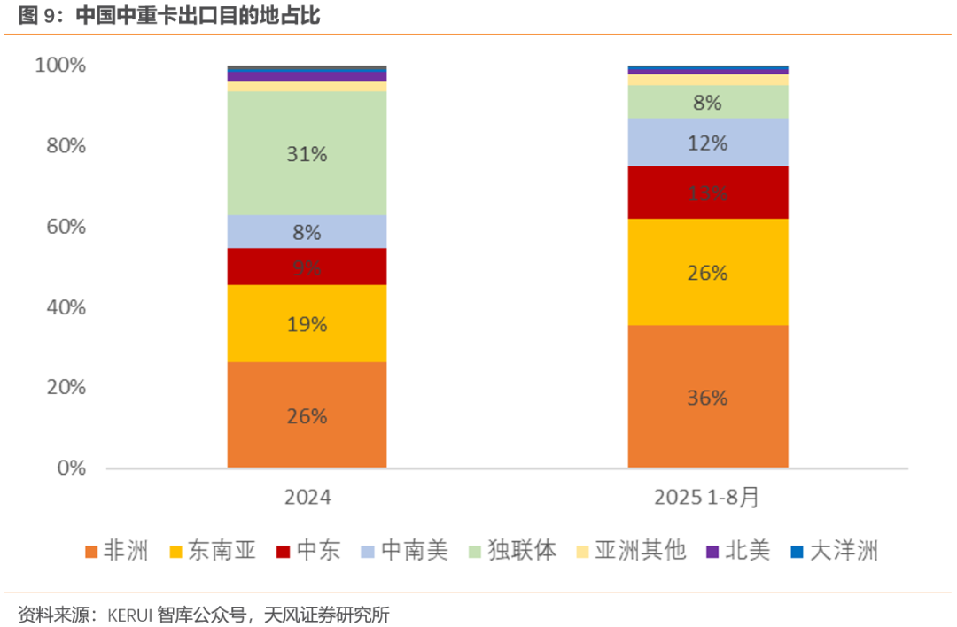 独联体市场2023和2024年是中国中重卡出口第一大地区,但随独联体本地企业逐渐恢复生产,以及当地报废税上涨,2025年中国出口出现大幅下降;