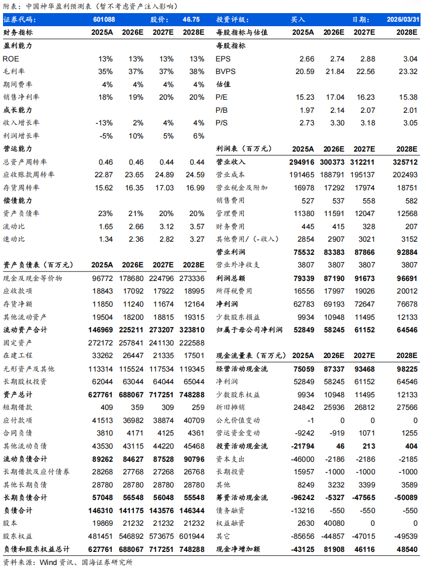 盈利预测与估值:暂不考虑资产注入,预计公司2026-2028年营业收入分别为3004/3122/3257亿元,归母净利润分别为582/612/645亿元,同比 10%/ 5%/ 6%;EPS分别为2.74/2.88/3.04元,对应当前股价PE为17/16/15倍。公司具备“煤电路港航”产业链一体化优势,煤炭销售长协占比高,业绩稳健,长期重视投资者回报,分红比例高,央企市值考核推动下,估值有望进一步提升,维持“买入”评级。