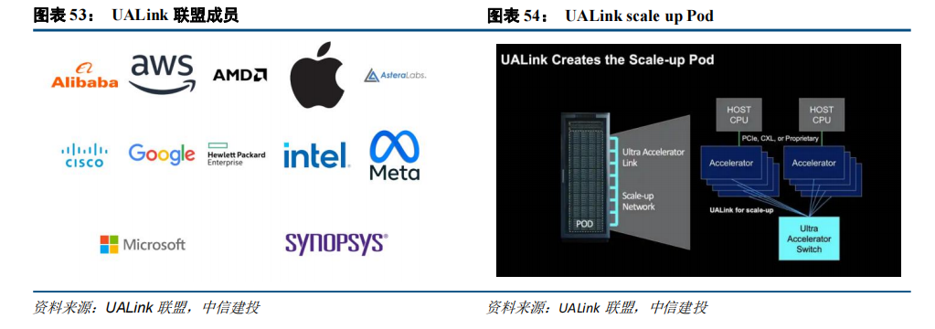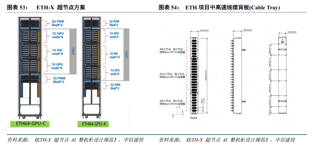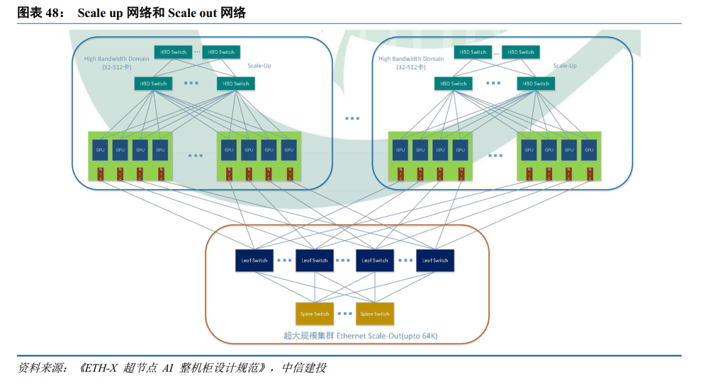 在开放协议中,目前的开放标准不止一个,基本上都是以以太网技术(ETH)为基础,以太网技术最成熟、最开放,也拥有最多的参与企业。在超节点开放标准中,其中比较有代表性的,是由开放数据中心委员会(ODCC)主导、中国信通院与腾讯牵头设计的ETH-X开放超节点项目。在 ETH-X 的架构中, 分为 Scale-up 和 Scale-out 两个主要组网部分, 其中 Scale-up 网络负责 HBD 内部 GPU 与 GPU 之间的互联, HBD可以由一个或者多个高功率 Rack 组成,通过 Scale-up 进行扩展;多个 HBD 通过 Scale-out 的扩展方式组成更大的 GPU 集群。国内字节、阿里、腾讯新一代服务器分别采用超节点设计,预期将进一步带动铜连接整体市场空间。