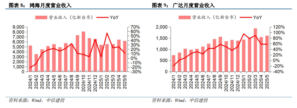 GB200服务器进入规模化量产阶段,Blackwell将接替Hopper成为出货主力。在GTC 2024大会上,英伟达正式发布了新一代Blackwell架构AI芯片,并推出了基于该架构的新型机架式AI服务器参考设计GB200。由于散热挑战与液冷系统泄漏等问题,GB200系统在2024年量产推进并不顺利,整体进度滞后于预期。随着英伟达与供应链合作逐步优化设计,并解决关键技术难题,24年底Blackwell平台开始进入爬坡阶段,开启对Hopper平台的替代。英伟达FY26Q1(2025年2月-4月)数据中心业务中近70%的收入已由Blackwell平台贡献。鸿海、广达等核心ODM供应商也普遍预计,GB200将在2025Q2加速放量,微软、Meta等多家云服务厂商也陆续部署新一代系统。