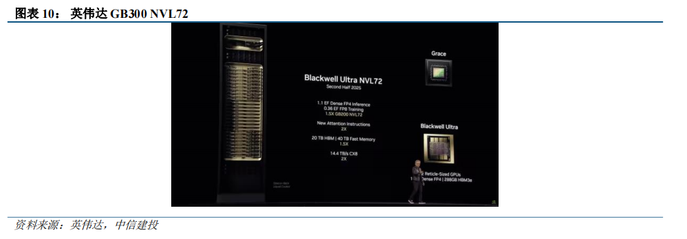 升级方案GB300有望于2025年下半年开启量产。英伟达在GTC 2025大会上披露,预计GB300将于2025年下半年量产上市。硬件方面,GB300采用12-Hi堆叠的HBM3e内存结构,每颗GPU配备288 GB显存,较GB200的192 GB提升50%。系统I/O也全面升级,整机网络带宽提升至1.6 Tbps,以满足更高并发推理的通信需求。在性能表现上,GB300 NVL72在FP4精度下的推理算力相较GB200 NVL72提升约1.5倍。为确保量产进度,英伟达此次在设计上回归稳定的Bianca板卡方案,并优化了液冷系统与供电模块。GB300将成为继GB200之后,又一轮AI服务器放量的关键驱动。