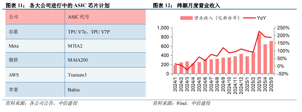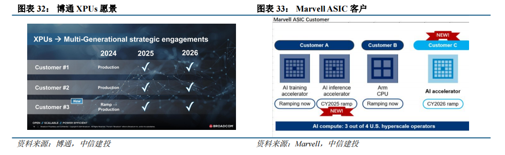 博通和Marvell均看好ASIC市场需求。博通和Marvell是ASIC定制领域的主要玩家,二者在AI定制芯片中占据了超70%的市场份额。博通定制的ASIC芯片广泛应用于数据中心、云计算、高性能计算(HPC)、5G无线基础设施等领域,根据博通最新财报,2025Q1公司AI芯片收入占比50%,同比增长77%,其中ASIC相关收入占比60%。博通认为XPU的需求会持续上涨,公司预计2025年下半年ASIC收入占比会持续上升,主要是因为推理模型需求增长使得AI芯片业务增速加快。Marvell的ASIC业务也成为公司强劲增长的核心动力之一。2024年12月初,Marvell与AWS达成了一项为期五年的战略合作协议,包括帮助亚马逊设计自有AI芯片。伴随AWS芯片的量产,Marvell在2025Q1实现营收18.95亿美元,同比增长63%,创历史新高。Marvell也预测,随着AI计算需求的增长,公司ASIC占比有望提升至25%,预计2028年数据中心ASIC市场规模将提升至429亿美元。