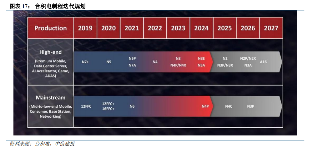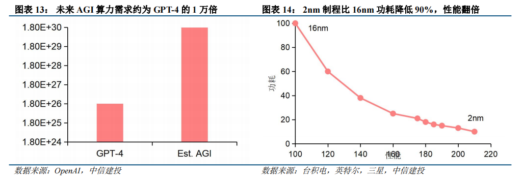 制程迭代是芯片算力提升的关键因素,AI算力需求的爆发催生了对先进制程的强需求。AI大模型发展对芯片算力提出更高要求,未来更成熟的AGI模型所需算力是现在GPT-4所需算力的1万倍。而解决高算力需求的一种方案是采用更为先进制程的芯片,因为芯片制程越先进,功耗越低、计算速度越快。如2nm芯片功耗约为16nm芯片的10%,而性能约为16nm芯片的2倍以上。台积电估计其即将推出的N2P节点的功耗可能比N3E节点低30-40%。