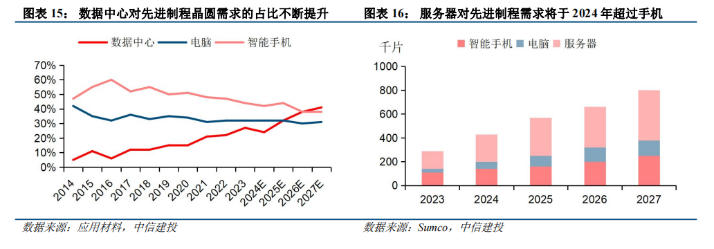 服务器需求将超过智能手机成为先进制程最主要的驱动力。历史上,智能手机的迭代更新推动了芯片制程的不断演进,但随着AI应用的计算需求上升,服务器成为主要的算力中心,且对高算力的追求使得其对先进制程呈现出越来越高的需求,AI芯片功耗较高,且需要更小的尺寸,因此AI芯片对先进制程的迫切需求将推动服务器需求成为先进制程最大的驱动力。Sumco估计,在AI服务器出货量强劲增长的推动下,服务器对先进制程晶圆的需求量最快将在2024年超过智能手机。