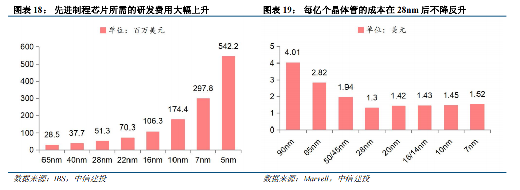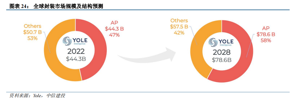先进制程面临物理约束瓶颈,先进封装成为提高芯片性能的重要解决方案。AI大发展使得算力需求爆发式增长,然而,随着半导体工艺尺寸进一步缩小,集成电路制造面临的挑战日益增大,摩尔定律日趋放缓,单位晶体管的成本不降反升,应用先进制程的芯片研发费用也大幅增长。先进封装通过异构集成,将多个芯粒(Chiplets)高密度连接在一起,整体性能提升不再依赖单一芯片支持,且大幅提升良率,降低成本,成为提供系统级性能提升的新路径。