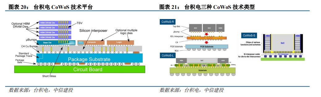 CoWoS为HPC和AI计算领域广泛使用的先进封装技术。CoWoS是台积电推出的 2.5D封装技术,本质上是将多个芯片(如逻辑芯片 HBM)放置在一块硅中介层(interposer)上,再封装在基板上,2012年首先应用于Xilinx的FPGA上。此后,英伟达、AMD、谷歌等厂商的AI芯片均采用了CoWoS,例如A100、H100。如今CoWoS已成为HPC和AI计算领域广泛应用的2.5D封装技术,绝大多数使用HBM的高性能芯片,包括大部分创企的AI训练芯片都应用CoWoS技术。
