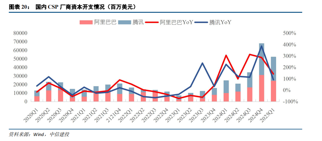 从阿里巴巴以及英伟达的最新财报来看,国内外CSP厂商对于算力的投资仍然保持强劲的增长;阿里AI相关收入继续保持三位数增长,让人看到AI商业化落地的清晰路径,打消了投资者对AI投资回报的担忧。我们持续推荐算力板块,包括海外算力链和国产算力链。