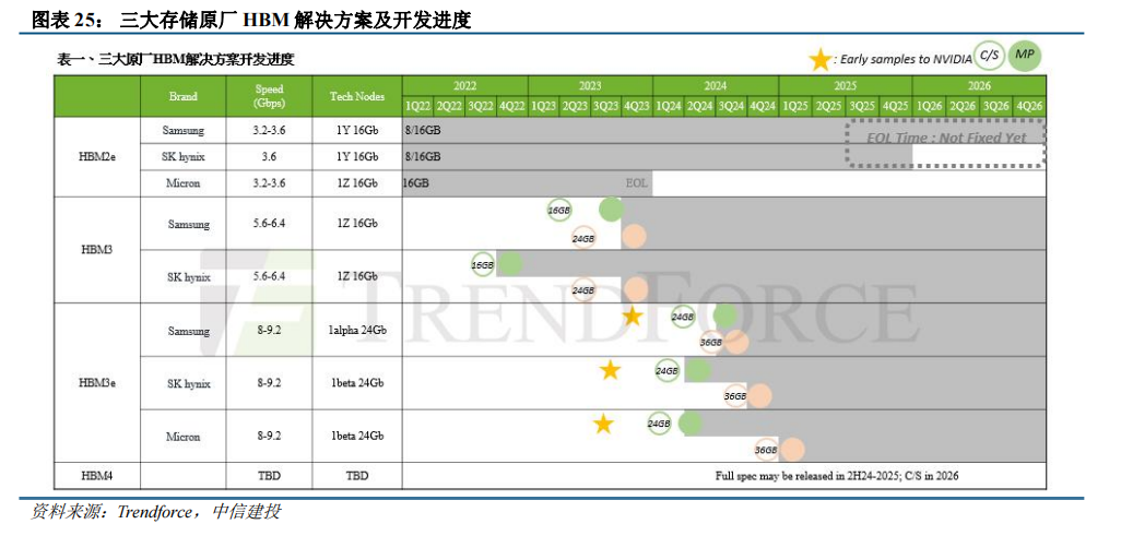 HBM快速迭代,HBM4即将进入量产。结构上,2025年HBM3e将占据主导,根据SK海力士,2024年其HBM3e收入将占HBM收入一半以上,2025年12层HBM3e供给量将超过8层产品,12层HBM4计划于25H2发货。(1)HBM3e:三大原厂相继推出12Hi产品,这些12Hi的HBM预计用在英伟达的B300A(B200A Ultra)和B300上。(2)HBM4:三星、海力士计划24Q4开始HBM4的流片,预计2026年用在英伟达下一代的Rubin芯片上。