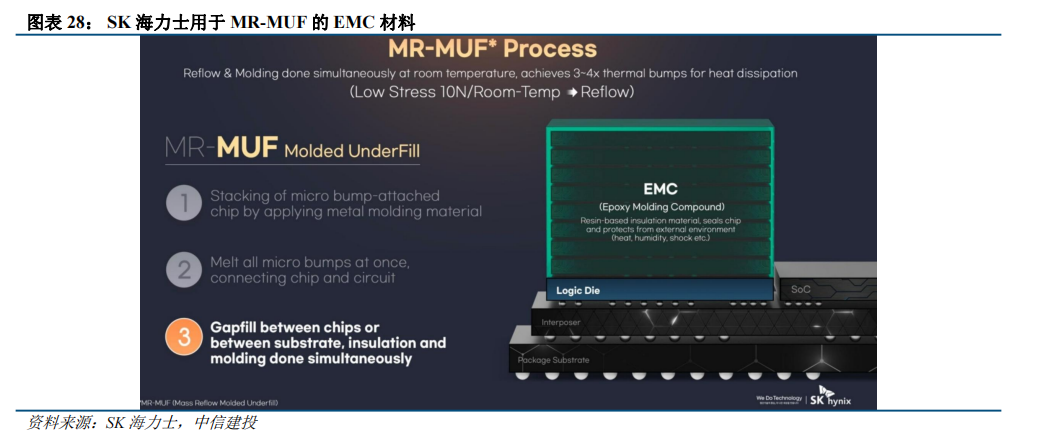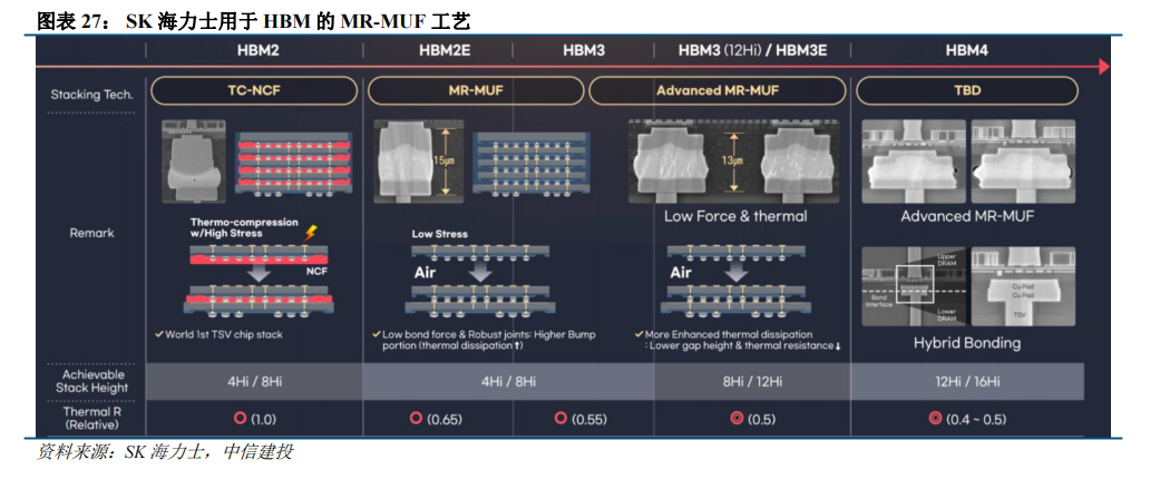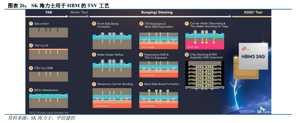 (1)TSV:不采用传统的布线方法来连接芯片与芯片,而是通过在芯片上钻孔并填充金属等导电材料以容纳电极来垂直连接芯片。制作带有TSV的晶圆后,通过封装在其顶部和底部形成微凸块(Micro Bumping),然后连接这些凸块。由于TSV允许凸块垂直连接,因此可以实现多芯片堆叠。最初,使用TSV接合的堆栈有4层,后来增加到8层。最近,一项技术使得堆叠12层成为可能,SK海力士于2023年4月开发了其12层HBM3。虽然TSV倒装芯片接合方法通常使用基于热压的非导电薄膜(TC-NCF),但SK海力士使用MR-MUF工艺,可以减少堆叠压力并实现自对准。这些特性使SK海力士能够开发出世界上第一个12层HBM3。