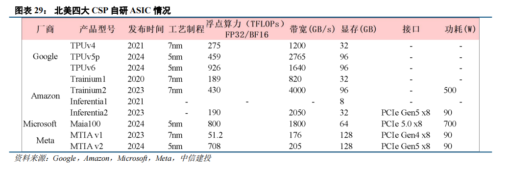 低成本是AI推理爆发的必要条件,北美CSP厂商均加速研发ASIC的步伐。大模型推理时代相较于移动互联网时代,底层逻辑发生了巨大变化。推理系统的成本几乎和客户使用量成线性关系,因此边际成本很高,且成本绝大部分是推理的算力消耗。因此,在大模型时代,能将推理成本降到极致的厂商有望获得最终的胜利。目前北美四大CSP厂商,除了继续采用英伟达GPU做模型训练之外,均在加速开发自家的ASIC产品,一方面因英伟达的GPU价格昂贵,硬件投入成本过高,另一方面,自研ASIC可针对特定需求进行优化,也能针对特定的应用进行设计,因此对于能耗或电力管理的控制将更加精准,此外,从供应链安全角度,也可以避免算力资源都来自英伟达、AMD等GPU厂商的风险。在同等预算下,AWS的Trainium 2可以比英伟达的H100 GPU更快速完成推理任务,且性价比提高了30%~40%。2025年底计划推出的Trainium3,其计算性能更是提高了2倍,能效有望提高40%。谷歌的TPU v5芯片在Llama-3推理场景中,单位算力成本较H100降低了70%。根据IDC数据,微软Azure自研ASIC后,硬件采购成本占比从75%降至58%,摆脱长期被动的议价困境。