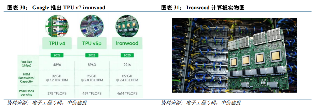 在Google Cloud Next 25大会上,谷歌又推出了第七代张量处理单元(TPU v7)Ironwood,它是谷歌迄今为止性能最高、可扩展性最强的定制ASIC芯片,也是首款专为推理而设计的加速器。Ironwood的每瓦性能是谷歌去年发布的第六代TPU Trillium的两倍,HBM容量及双向带宽均大幅提升。谷歌ASIC服务器计算板上有四个Ironwood TPU,这个与之前TPU v5计算板架构一样。