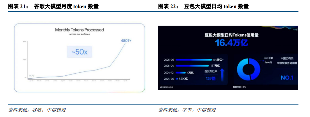 一是各家互联网大厂纷纷加速AI与原有业务结合,如谷歌搜索在今年5月21日正式迎来 AI 模式,并逐步在美国市场推出,考虑到谷歌搜索全球范围内年搜索量为5万亿次 ,假设单次回答平均为2000token,则该功能都将带来日均27万亿token消耗(超过其Gemini模型目前日均16万亿token消耗),类似案例如抖音搜索、微博AI智搜,搜索功能开始从普通服务器迁移到AI服务器并重塑所有搜索体验,类似的视频编辑、剪辑功能也被AI重塑;