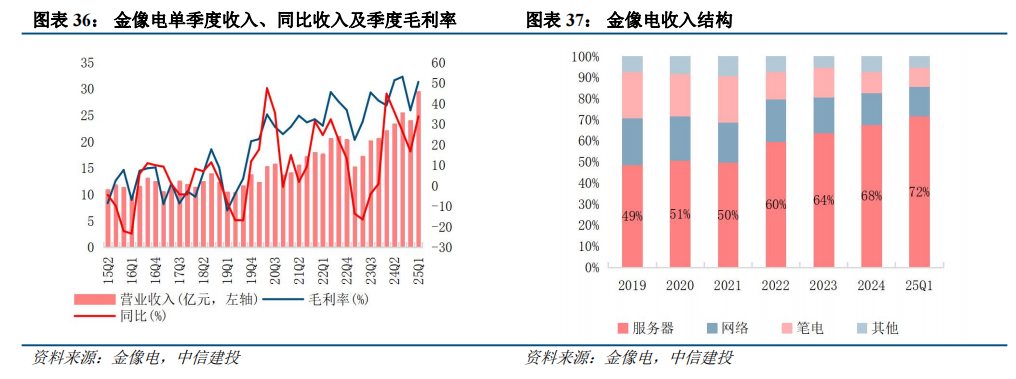 随云厂商积极自研ASIC芯片,ASIC正成为AI服务器市场中与GPU并行的重要架构,进一步带动高阶PCB的需求。金像电为全球服务器PCB第一大厂,也是ASIC服务器放量时PCB企业中的最大受益者。金像电的产品已经切入北美四大CSP,涵盖UBB、OAM(加速器模组)所需要的HDI、厚铜板等。根据金像电25Q1法说会资料,公司25Q1单季度实现收入29.52亿元,创历史新高,其中服务器收入占比持续提升,到72%。在传统服务器市场温和复苏背景下,金像电业绩高增核心来自于云厂商ASIC服务器PCB订单,根据公司交流,2024年AI产品占比已达20%,未来将持续提升。