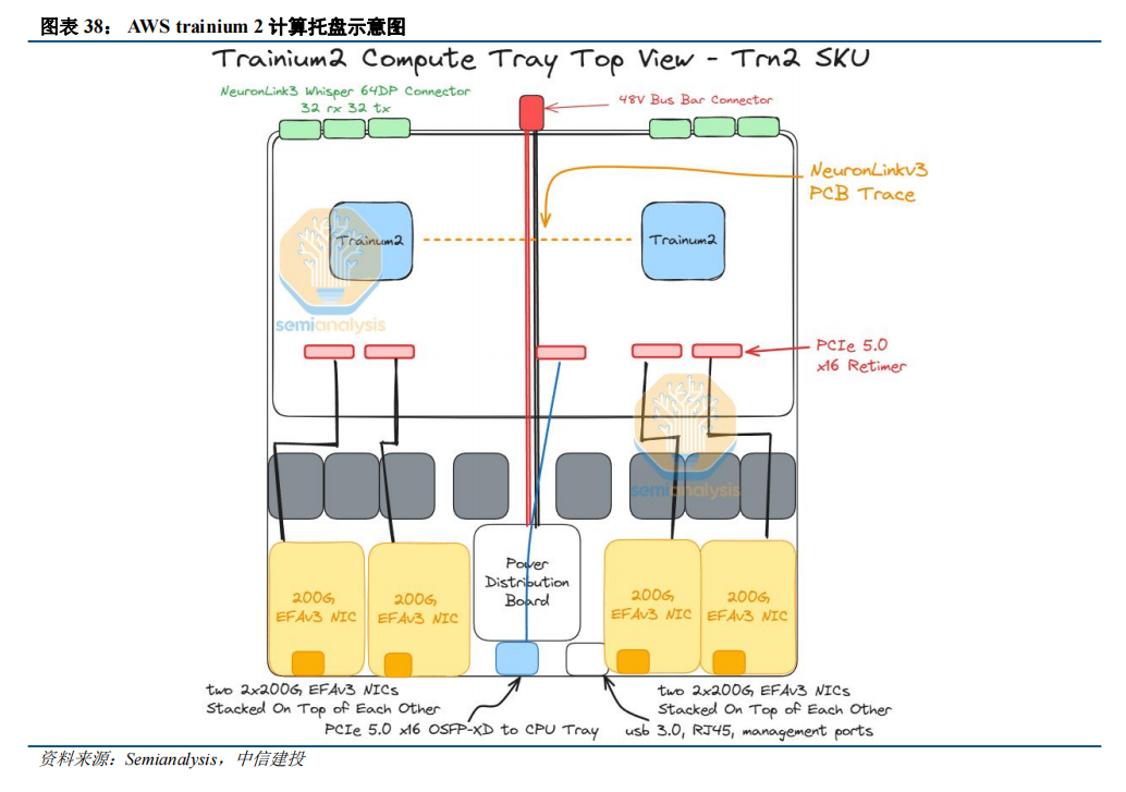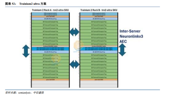 在AWS的Trainium2中,Scale up同样采用铜连接方案。每台服务器单元包括 64 个 Trainium2 芯片(跨两个机架)连接在一起,形成一个 4x4x4 三维环面的单一扩展世界大小,称为 Trainium2-ultra,同样采用DAC和AEC方案。