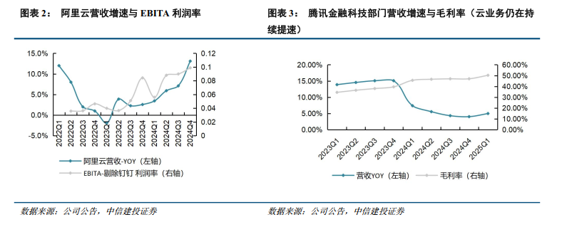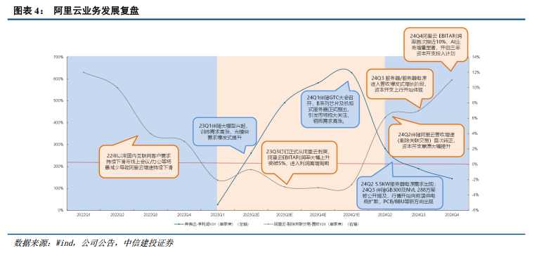 以阿里云为例,24Q2是阿里云算力投入决策的核心拐点。2022年以来,由于互联网大厂业务的快速收缩,阿里云营收增速快速下滑,同时伴随着云资源池利用率的降低,营业利润率随之下降。23年以来,通过提升公有云业务占比以提升利润率与发展AI以实现营收提速成为阿里云的核心战略。伴随24Q2阿里云营收增速首次由负转正(AI业务贡献较大增量),GPU实例业务的需求和盈利性的首次得到论证,因此从24Q3开始,阿里云CAPEX投入力度快速加大,并在24Q4的业绩交流会上宣布三年3800亿资本开支计划。