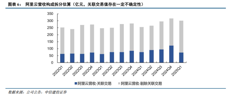 目前阿里云的营收分为对内关联交易和对外商务,对内AI部分主要支持夸克,钉钉,高德等调用通义/DeepSeek模型,对外创收中的AI业务主要包含GPU租赁、MaaS服务、模型服务(百炼与PAI平台)三类。由于近年来模型侧价值量逐渐被云端内化(MaaS的价值量被带入到了IaaS中),导致GPU租赁成为了公有云业务中毛利率更高的部分,大幅资本开支本质是为了让高毛利率GPU租赁业务占比快速扩大,以此拉动AI业务规模快速增长。在此思路下,从24Q2开始,AI业务成为支撑公有云增长核心动力,24Q2一半以上营收增速来自AI贡献,且在后续持续保持100%以上同比增长。