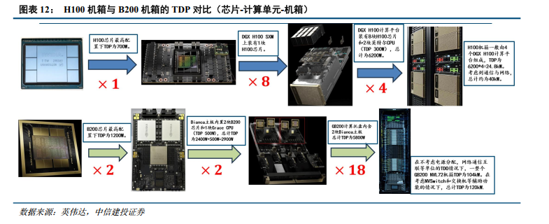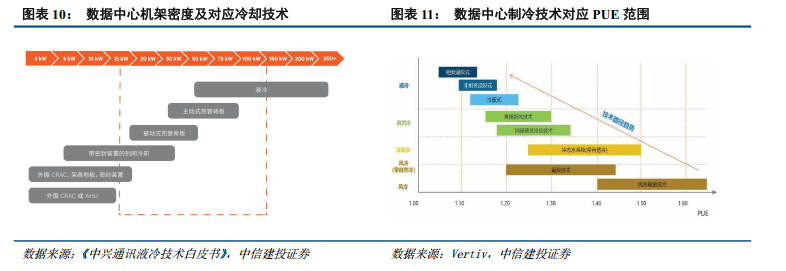 以英伟达GPU芯片为例,单芯片及机架热功耗增长迅速。英伟达的B系列芯片和NVL72机柜热设计功率TDP(Thermal Design Power)大幅提升:H100的TDP最高为700W,B200的TDP最高为1200W,增长约7成;H100每个机架的TDP约为40kW,B系列机架的TDP约为120kW,功率增约200%-500%。H100机柜主要采用风冷散热,但是由于受限于风冷散热效率较低和空间利用率低的缺点,GB200 NVL72机柜采用水冷散热。水冷散热能够提高芯片散热效率,大幅提高计算密度从而降低芯片互联之间的延时,进一步降低模型训练成本。