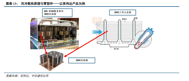 风冷散热主要元件:热界面材料TIM(直接覆盖在GPU之上)、集成散热器IHS(与TIM相连)、多维两相均温元件3DVC(由热管和散热片组成,安置在IHS之上)、风扇(安置在服务器最前面或者最后)。3DVC的得名来自于1维的热管、2维的散热片、3维的热管与散热片腔体互通;VC(蒸汽室)来自于液体蒸发冷凝的过程。风冷散热原理方面,芯片的热量通过TIM传导至IHS之上,热量进入3DVC中将3DVC中的液体蒸发为蒸汽,蒸汽通过热管向上传导至上方多层散热片中。由服务器前端和后端的风扇和数据中心的空调将腔体内的蒸汽冷凝为液体,过程循环往复。因此,风冷散热有两部分组成:每个芯片上方的多维两相均温元件与服务整个服务器散热的风扇和数据中心的空调。