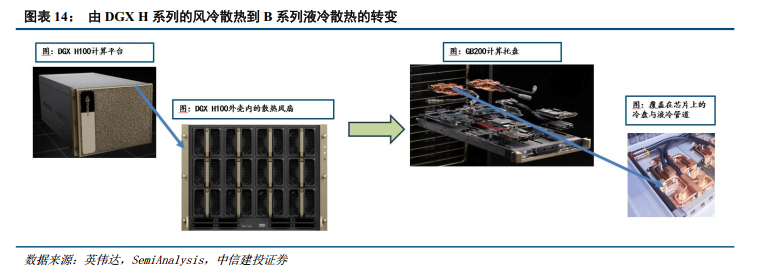 液冷散热在散热能力及空间利用率方面优势显著。水的热容量为空气的4000倍,热导率是空气的25倍。在相同温度变化中,水能存储更多的热量且热量的传递速度远超空气。GB200的水冷计算托盘设计利用冷板与冷却液的高效热交换机制,将芯片产生的热量均匀传递至冷板表面。冷却液以高流速经过冷板后能够迅速带走热量并均匀散热。空间利用率方面。风冷的HGX H100计算平台高度大概为6U(1U=4.445cm)。而采用风冷设计的HGX B200则需要10U高度的风冷设备达到散热需求。相比较而言,使用DLC的GB200计算托盘的高度仅为1U。同样部署8块GPU芯片,HGX H100高度为6U,HGX B200需要10U,而GB200 NVL72只需要2个计算托盘总计高度为2U。空间利用率大幅提升。
