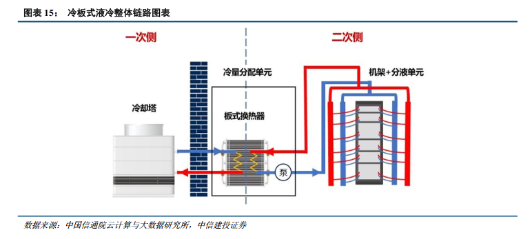 冷板式液冷可带走70%-75%的热量。冷板式液冷通过冷板将芯片等发热元器件的热量间接传递给封闭在循环管路中的冷却液体,冷却液带走热量,并将其传递到一次侧回路,通过冷却系统进行冷却,最后将热量排出系统。冷板式液冷系统可以分为一次侧(室外)循环和二次侧循环(室内)两部分。其中,二次侧循环主要通过冷却液温度的升降实现热量转移,而一次侧的热量转移主要是通过水温的升降实现。成本方面,一次侧占到液冷成本的30%左右,二次侧占70%左右。从冷却效果来看,冷板一般使用在平坦表面时换热效果最佳,例如CPU、GPU和存储器模块等,不适用于电源和IC电容器等其它组件,综合来看,冷板液冷可带走机架中设备产生的70-75%的热量,因此需要采用混合冷却方法。